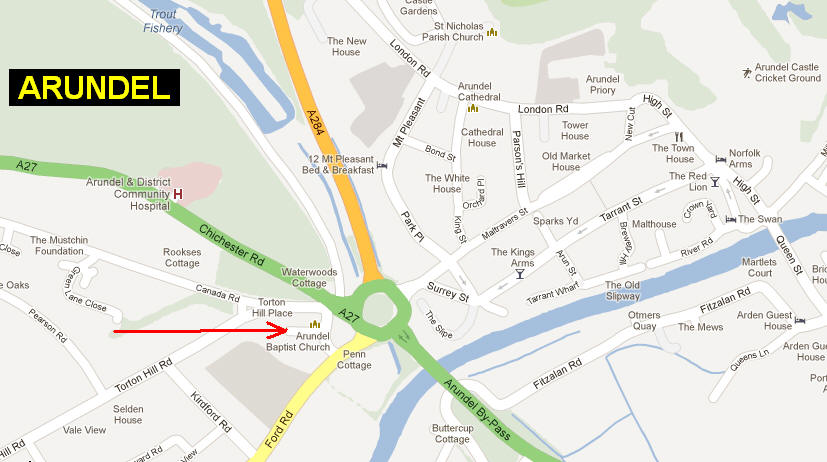 Approaching Arundel from Worthing on the A27, pass Arundel station on your left and continue to the roundabout taking the 1st exit and remaining on the A27. Continue for approximately half a mile, over the River Arun bridge to the next roundabout. Take the 1st exit off the roundabout and continue for approximately 30 yards. Take the first right turn into Torton Hill Road. The church is approximately 30 yards on your left.